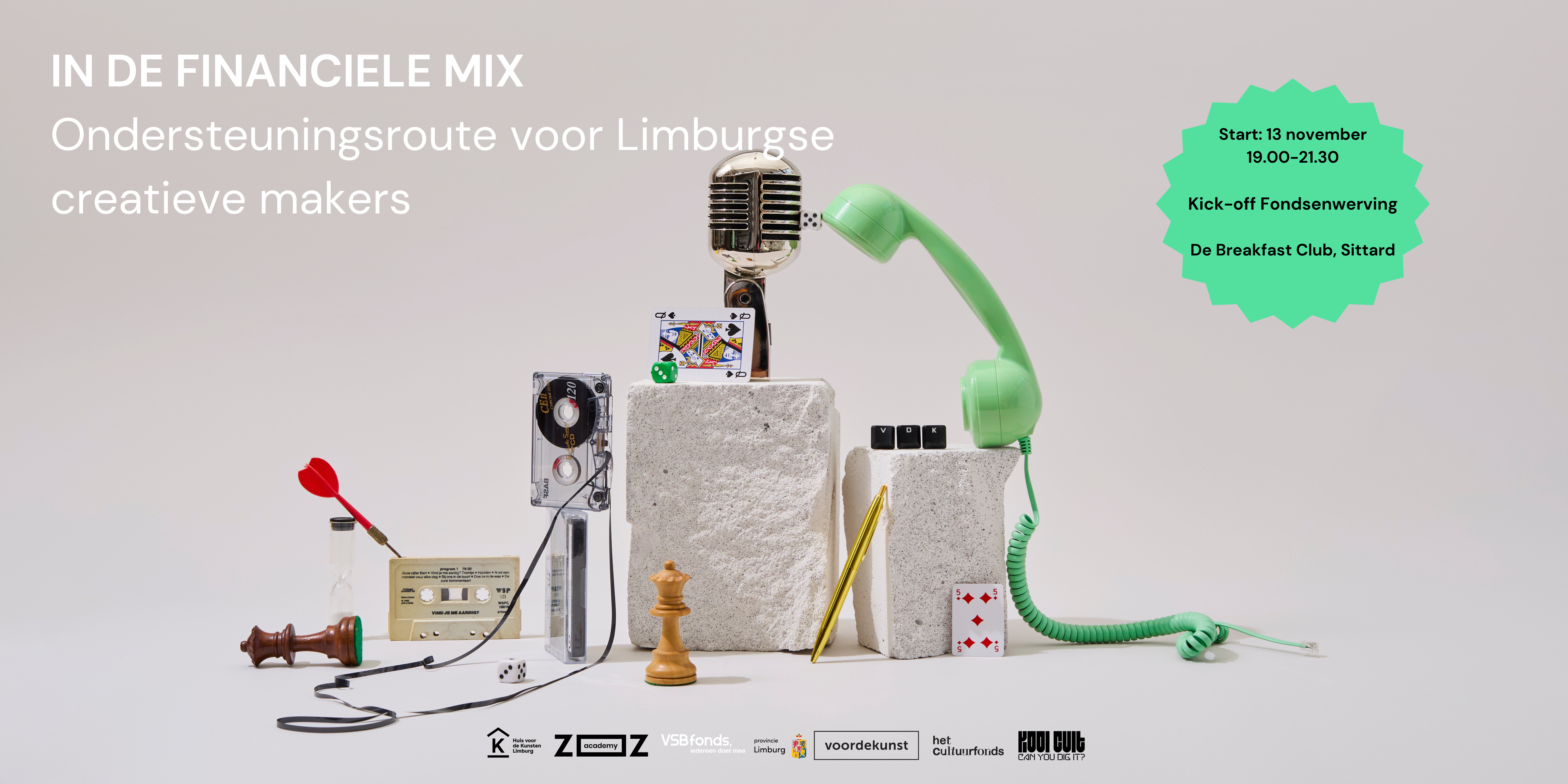 IN DE FINANCIËLE MIX is een initiatief van VSBfonds, het Cultuurfonds Limburg, Provincie Limburg en voordekunst in samenwerking met Koolcult, Pop in Limburg en Huis voor de Kunsten Limburg. De ondersteuningsroute begint op 13 november met een kick-off in de Breakfast Club in Sittard.
